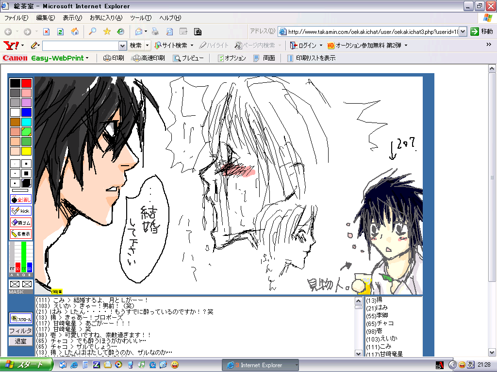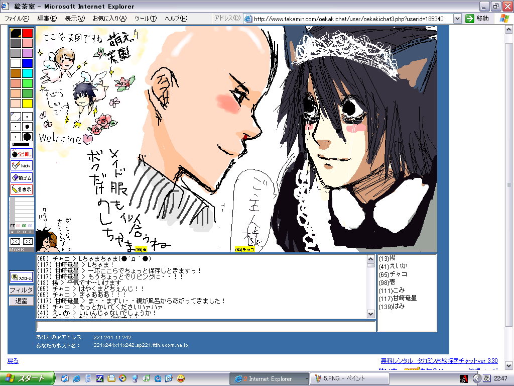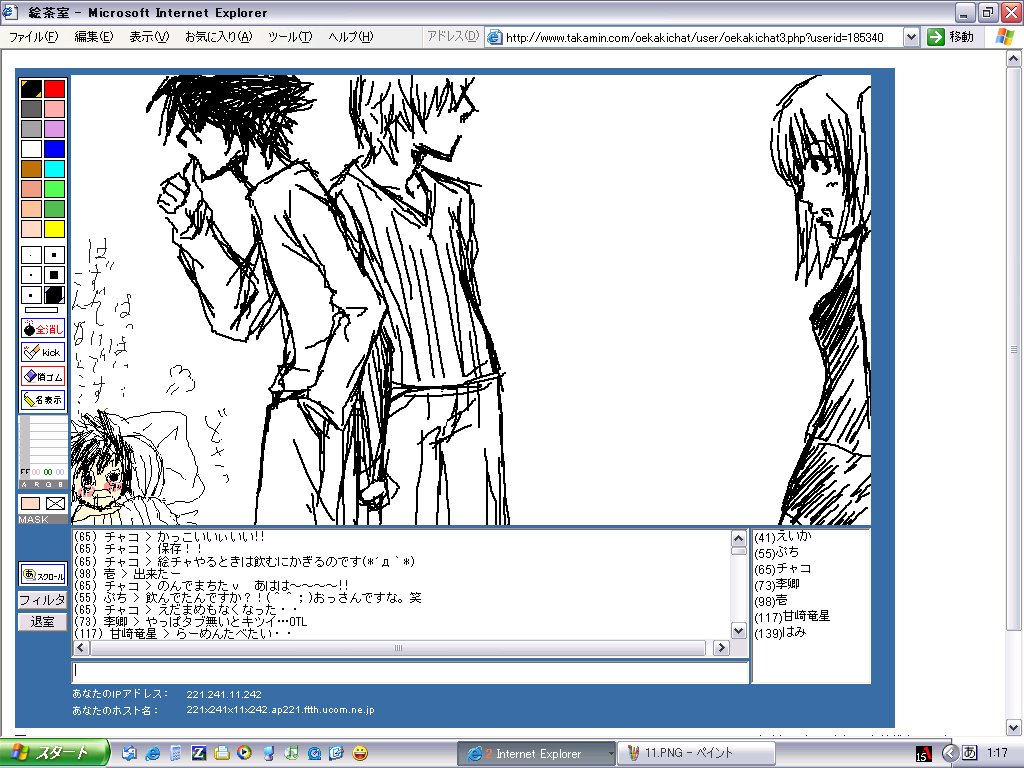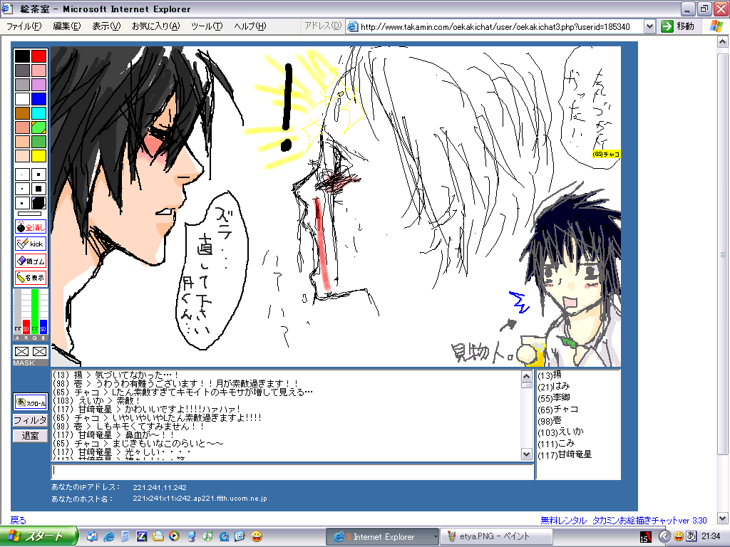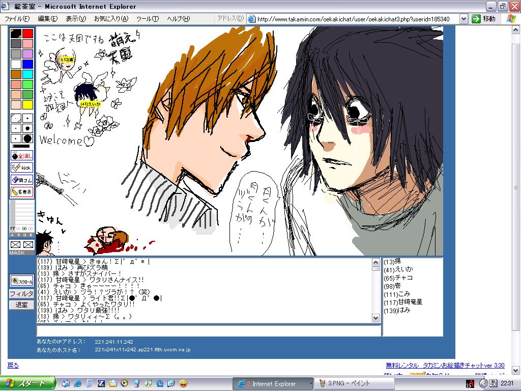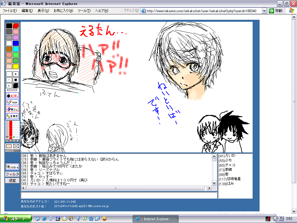 まぁ何とか、絵茶の窓を縮小して、絵茶の文字の部分だけを表示させて、上は見ない様にしながら文字だけ打ってました。